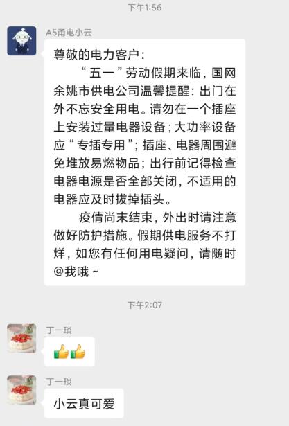 中國電力網(wǎng)訊 “‘五一’勞動節(jié)假期來臨,國網(wǎng)余姚市供電公司溫馨提醒:出門在外不忘安全用電。假期供電服務(wù)不打烊,如您有任何用電疑問,請隨時@我哦~”4月29日下午2點,余姚市陽光水岸小區(qū)微信群中收到這樣一條微信,受到小區(qū)群眾的一致好評。