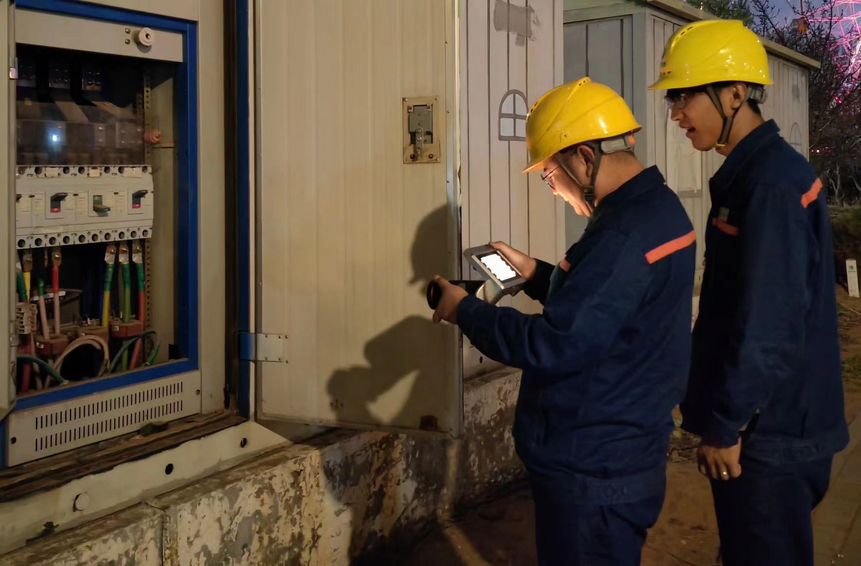 6月24日20時(shí),熙熙攘攘的人群里,郭智遠(yuǎn)和袁小龍穿行其中。今晚,他倆要完成蒙欣廣場和德榮2個(gè)夜市的用電安全檢查。“迎峰度夏期間工作量大,全憑兩條腿,必須要到現(xiàn)場實(shí)際檢查才能放心。”他們利用紅外測溫儀通過電暈、局部放電、溫升燒紅等現(xiàn)象來發(fā)現(xiàn)導(dǎo)線連接器及絕緣子存在的缺陷。對蒙欣廣場夜市、德榮夜市線路刀閘閘口、接頭、導(dǎo)線線夾等易發(fā)熱部位進(jìn)行全方位檢查,及時(shí)掌握設(shè)備運(yùn)行狀態(tài),避免設(shè)備出現(xiàn)故障。結(jié)束了夜市的用電安全檢查,收拾好工器具,已是22:20,但汗流浹背的兩個(gè)人并沒有回程,他們還要前往體育館的10千伏線路開展夜巡工作。