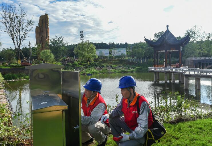 7月18日,在安徽省定遠(yuǎn)縣西卅店鎮(zhèn)“金山溪谷”旅游景點(diǎn),國(guó)網(wǎng)滁州供電公司皖美共產(chǎn)黨員服務(wù)隊(duì)員楊海榮、王培雨等對(duì)景區(qū)用電設(shè)備開展安全檢查,保障游客人身安全。