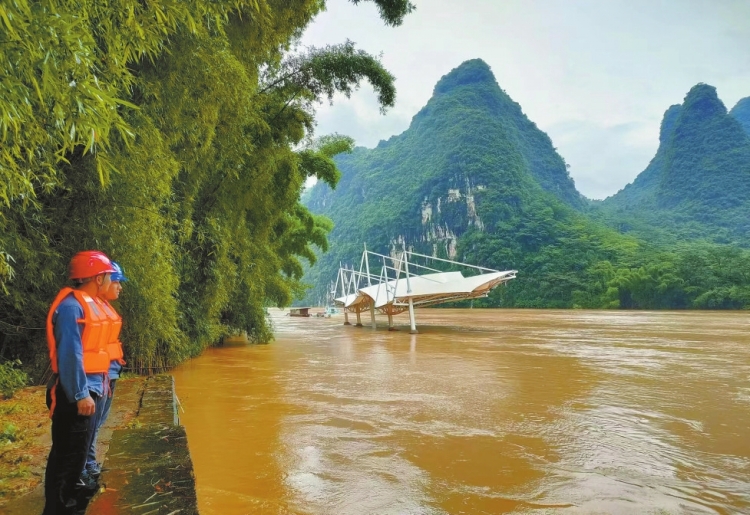 6月18日,廣西電網(wǎng)公司桂林陽(yáng)朔供電局葡萄供電所員工在楊堤碼頭觀測(cè)水情。 謝運(yùn)芳 攝