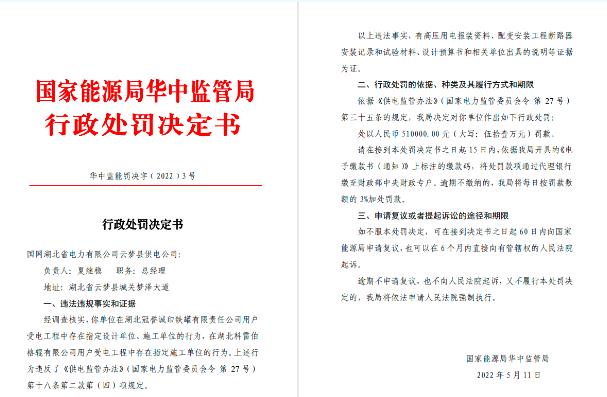 國家能源局華中監(jiān)管局12月7日公布的一則行政處罰信息顯示,國網(wǎng)湖北省電力有限公司云夢縣供電公司在用戶受電工程中存在指定設(shè)計(jì)單位、施工單位的行為,被處以罰款51萬元。