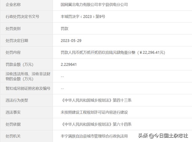 據(jù)河北省承德市豐寧滿(mǎn)族自治縣城市管理綜合行政執(zhí)法局5月29日公布的“豐城罰決字﹝2023﹞第9號(hào)”行政處罰信息顯示,國(guó)網(wǎng)冀北電力有限公司豐寧縣供電分公司因未按照建設(shè)工程規(guī)劃許可證內(nèi)容進(jìn)行建設(shè),被處以罰款2.229641萬(wàn)元。