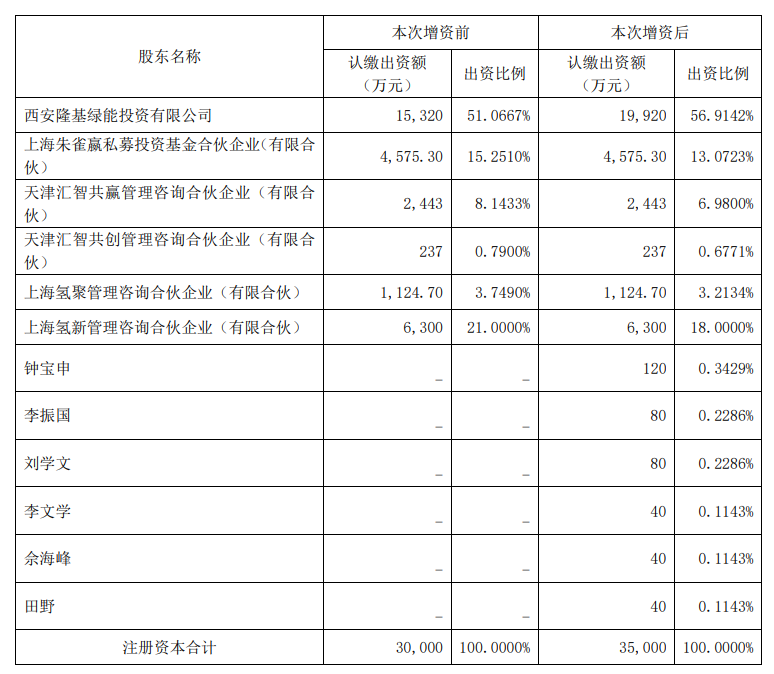 公告顯示,基于對隆基氫能未來發(fā)展的信心,根據(jù)經營需要,公司通過全資子公司隆基投資向其控股子公司隆基氫能增資4.6億元,其中4600萬元增加隆基氫能注冊資本,4.14億元計入隆基氫能資本公積;公司董事、高級管理人員及經營團隊核心管理人員鐘寶申、李振國、劉學文、李文學、佘海峰、田野六人向隆基氫能增資4000萬元,其中400萬元增加隆基氫能注冊資本,3600萬元計入隆基氫能資本公積。本次合計增資5億元,其中5000萬元增加隆基氫能注冊資本,4.5億元計入隆基氫能資本公積,本次增資完成后,隆基氫能的注冊資本將增加至3.5億元。