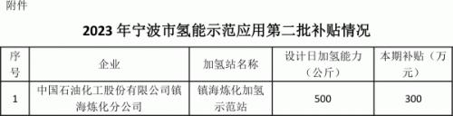 12月19日,浙江寧波市發(fā)改委公示了2023年寧波市氫能示范應(yīng)用第二批補(bǔ)貼情況,中國石油化工股份有限公司鎮(zhèn)海煉化分公司的鎮(zhèn)海煉化加氫示范站入圍,該加氫站設(shè)計(jì)日加氫能力500公斤,將獲得300萬元的補(bǔ)貼。