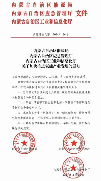通知明確,允許在化工園區(qū)外建設(shè)太陽能、風(fēng)能等可再生能源電解水制氫項目和制氫加氫站。太陽能、風(fēng)能等可再生能源電解水制氫項目不需取得危險化學(xué)品安全生產(chǎn)許可??稍偕茉措娊馑茪涞膬Υ?、運輸、充裝、使用執(zhí)行現(xiàn)行相關(guān)規(guī)定。