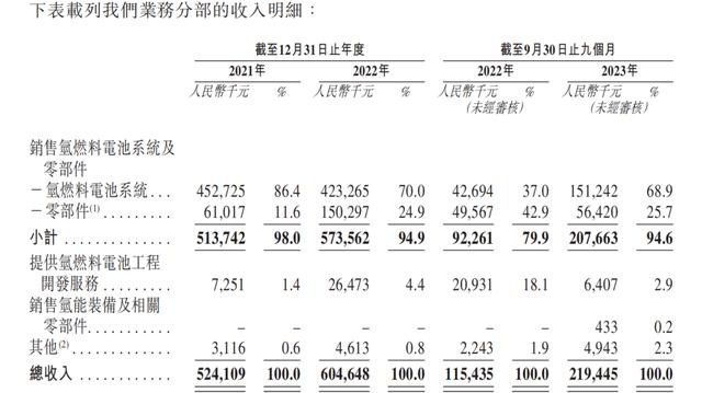 目前,重塑能源主要收入來源為銷售氫燃料電池及零部件,報(bào)告期內(nèi)收入占比均超九成。