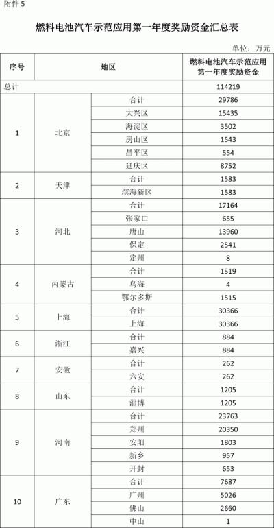 根據(jù)公示文件,第一年度共有10個省級行政區(qū)獲得燃料電池車示范應(yīng)用獎勵資金,其中北京29786萬元、天津1583萬元、河北17164萬元、內(nèi)蒙古1519萬元、上海30366萬元、浙江884萬元、安徽262萬元、山東1205萬元、河南23763萬元、廣東7687萬元,總計114219萬元。