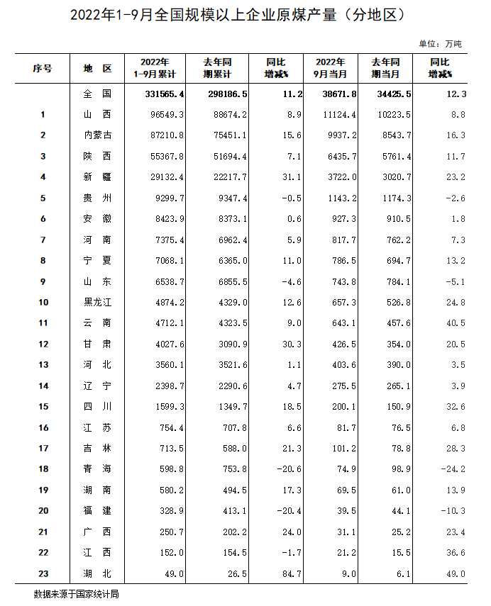 2022年1-9月全國分省區(qū)原煤產(chǎn)量