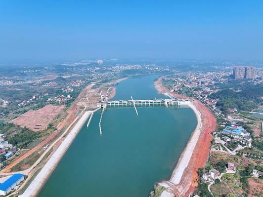 樞紐電站共配備4臺(tái)單機(jī)容量8.5MW燈泡貫流式水輪發(fā)電機(jī)組,轉(zhuǎn)輪直徑4.7m,總裝機(jī)34MW,電站廠房布置于右岸河床,計(jì)劃2024年4月全部機(jī)組投產(chǎn)發(fā)電,設(shè)計(jì)年均發(fā)電量可達(dá)1.15億度。
