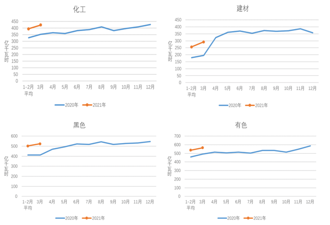 1-3月,化工行業(yè)用電量1214億千瓦時(shí),同比增長14.0%,增速比上年同期提高19.8個(gè)百分點(diǎn);建材行業(yè)用電量805億千瓦時(shí),同比增長40.9%,增速比上年同期提高59.8個(gè)百分點(diǎn);黑色金屬冶煉行業(yè)用電量1530億千瓦時(shí),同比增長20.9%,增速比上年同期提高24.1個(gè)百分點(diǎn);有色金屬冶煉行業(yè)用電量1639億千瓦時(shí),同比增長12.1%,增速比上年同期提高11.2個(gè)百分點(diǎn)。