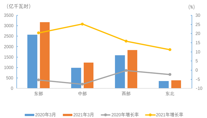 3月份,東、中、西部和東北地區(qū)全社會(huì)用電量增速分別為20.4%、25.3%、15.8%和11.2%。