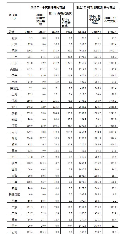 據(jù)國家能源局消息,國家能源局公布2023年一季度光伏發(fā)電建設(shè)運(yùn)行情況。一季度新增并網(wǎng)容量3365.6萬千瓦。其中,集中式光伏電站1552.5萬千瓦,分布式光伏1813.0萬千瓦。截至2023年3月底累計并網(wǎng)容量42522.2萬千瓦。