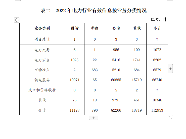 電力行業(yè)排在首位,有效信息數量為112953件,占全部有效信息的68.82%。群眾關注的內容主要集中在供電服務、電力安全、市場準入等方面。(2022年電力行業(yè)有效信息按業(yè)務分類情況見表二)