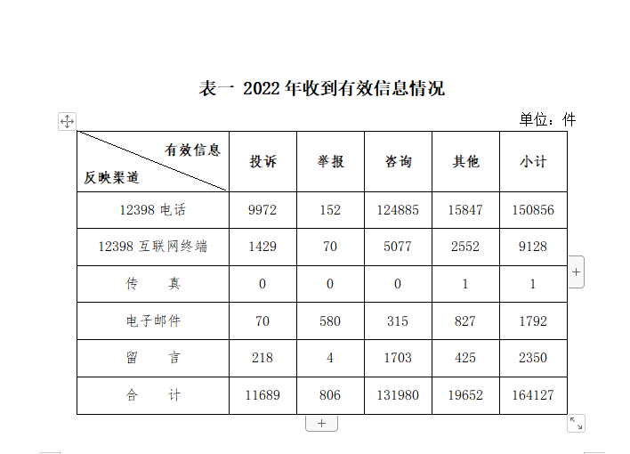 按反映渠道分類,12398電話150856件,12398互聯網終端9128件,傳真1件,電子郵件1792件,留言2350件。