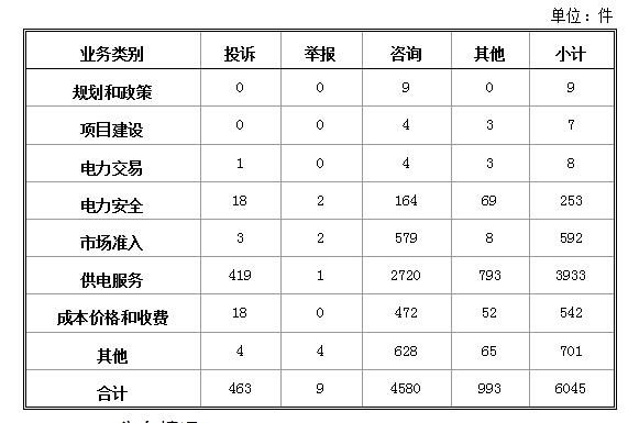 投訴舉報(bào)主要集中在電力行業(yè),共472件。從業(yè)務(wù)分類情況看,電力交易方面1件,占0.21%;電力安全方面20件,占4.24%;市場(chǎng)準(zhǔn)入方面5件,占1.06%;供電服務(wù)方面420件,占88.98%;成本價(jià)格和收費(fèi)方面18件,占3.81%;其他方面8件,占1.69%。(2018年1月電力行業(yè)有效信息按業(yè)務(wù)分類情況見(jiàn)表二)
