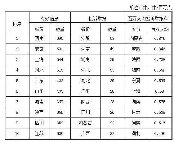 2018年1月,各?。ㄗ灾螀^(qū)、直轄市)按照有效信息數(shù)量排序,河南、安徽、上海等?。ㄊ校┝腥珖?guó)前10位;按照投訴舉報(bào)數(shù)量排序,安徽、河南、湖南等省排在全國(guó)前10位;按照百萬(wàn)人均投訴舉報(bào)率排序,內(nèi)蒙古、安徽、陜西等?。ㄗ灾螀^(qū))位于全國(guó)前10位。(2018年1月有效信息及投訴舉報(bào)排名前10位情況見(jiàn)表三)