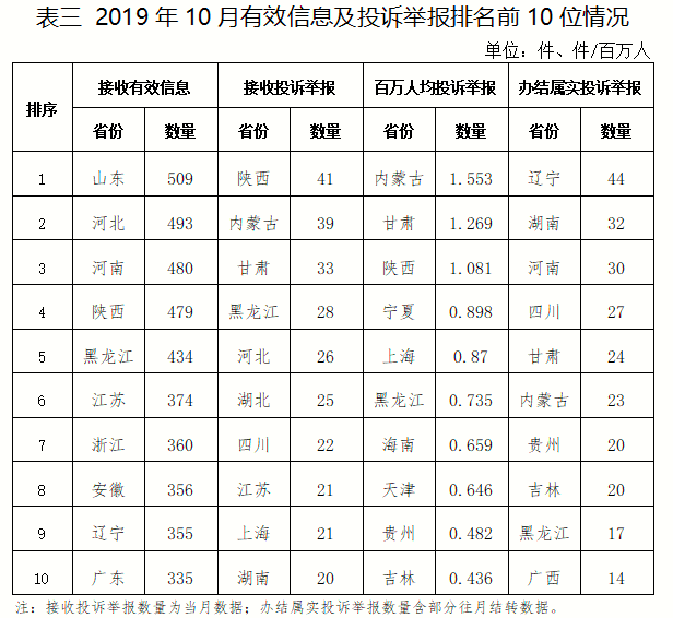 各?。ㄗ灾螀^(qū)、直轄市)按照收到的有效信息數(shù)量排序,山東、河北、河南、陜西、黑龍江等列全國(guó)前10位;按照投訴舉報(bào)數(shù)量排序,陜西、內(nèi)蒙古、甘肅、黑龍江、河北等排在全國(guó)前10位;按照百萬人均投訴舉報(bào)數(shù)量排序,內(nèi)蒙古、甘肅、陜西、寧夏、上海等排在全國(guó)前10位;按照辦結(jié)屬實(shí)投訴舉報(bào)數(shù)量排序,遼寧、湖南、河南、四川、甘肅等排在全國(guó)前10位。(2019年10月有效信息及投訴舉報(bào)排名前10位情況見表三)