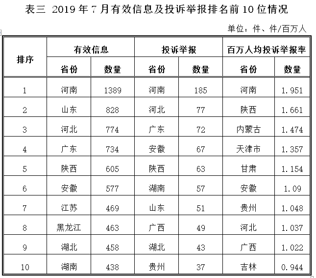 各?。ㄗ灾螀^(qū)、直轄市)按照收到的有效信息數量排序,河南、山東、河北、廣東、陜西等排在全國前10位;按照投訴舉報數量排序,河南、河北、廣東、安徽、陜西等排在全國前10位;按照百萬人均投訴舉報數量排序,河南、陜西、內蒙古、天津、甘肅等排在全國前10位。(2019年7月有效信息及投訴舉報排名前10位情況見表三)