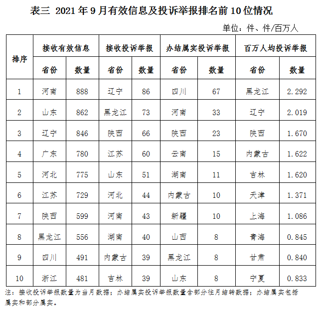 各省(自治區(qū)、直轄市)按照接收的有效信息數(shù)量排序,河南、山東、遼寧、廣東、河北、江蘇、陜西、黑龍江、四川、浙江列全國前10位;按照接收的投訴舉報數(shù)量排序,遼寧、黑龍江、陜西、江蘇、山東、河北、河南、湖南、內(nèi)蒙古、吉林排在全國前10位;按照辦結(jié)屬實(shí)的投訴舉報數(shù)量排序,四川、河南、陜西、云南、湖南、內(nèi)蒙古、新疆、山西、黑龍江、山東排在全國前10位;按照百萬人均投訴舉報數(shù)量排序,黑龍江、遼寧、陜西、內(nèi)蒙古、吉林、天津、上海、青海、甘肅、寧夏排在全國前10位。(2021年9月有效信息及投訴舉報排名前10位情況見表三)