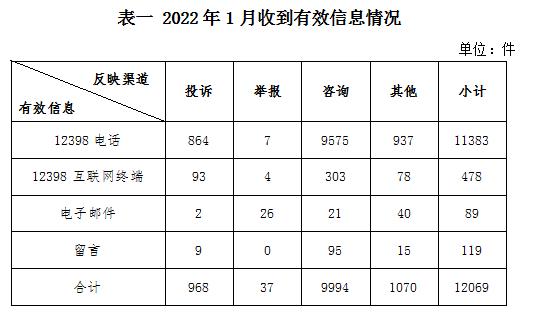 2022年1月,國(guó)家能源局12398能源監(jiān)管熱線(以下簡(jiǎn)稱12398熱線)共收到有效信息12069件(包含投訴、舉報(bào)、咨詢和其他訴求類別),環(huán)比減少10.77%,同比減少6.45%。(2022年1月收到有效信息情況見表一)