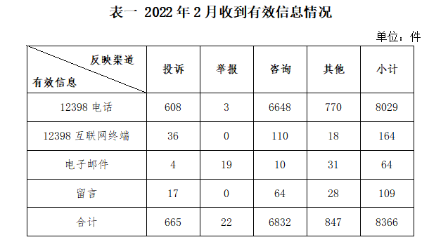 2022年2月,國家能源局12398能源監(jiān)管熱線(以下簡稱12398熱線)共收到有效信息8366件(包含投訴、舉報、咨詢和其他訴求類別),環(huán)比減少30.68%,同比增加10.27%。(2022年2月收到有效信息情況見表一)
