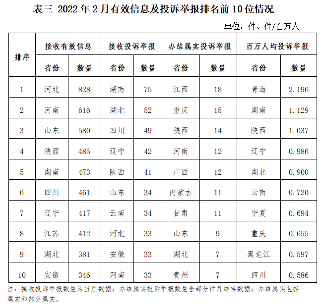 各省(自治區(qū)、直轄市)按照接收的有效信息數(shù)量排序,河北、河南、山東、陜西、湖南、四川、遼寧、江蘇、湖北、安徽排在全國前10位;按照接收的投訴舉報數(shù)量排序,湖南、湖北、四川、遼寧、陜西、山東、云南、河北、安徽、河南排在全國前10位;按照辦結屬實的投訴舉報數(shù)量排序,江西、重慶、陜西、河南、廣西、內蒙古、甘肅、山東、湖北、貴州排在全國前10位;按照百萬人均投訴舉報數(shù)量排序,青海、湖南、陜西、遼寧、湖北、云南、寧夏、重慶、黑龍江、四川排在全國前10位。(2022年2月有效信息及投訴舉報排名前10位情況見表三)