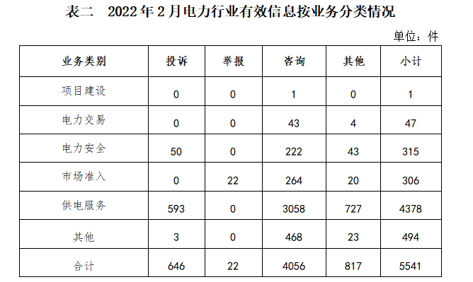 電力行業(yè)排在首位,有效信息數(shù)量為5541件,占全部有效信息的66.24%。群眾關注的內容主要集中在供電服務、電力安全、成本價格和收費等方面。(2022年2月電力行業(yè)有效信息按業(yè)務分類情況見表二)