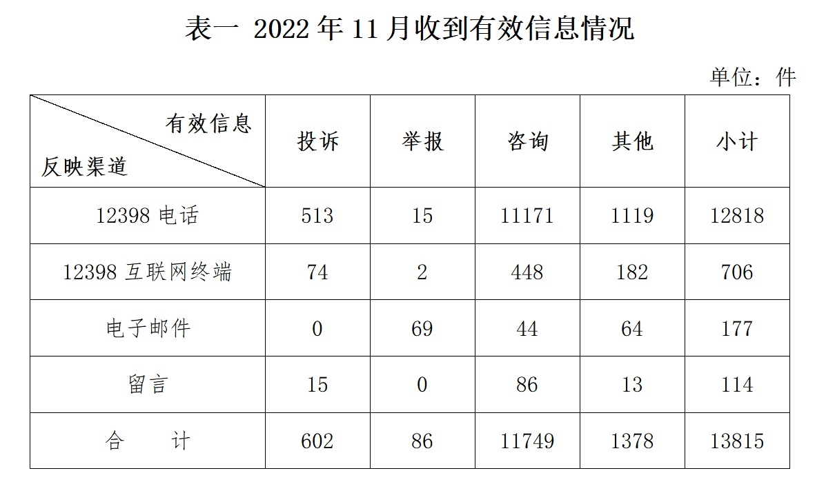 2022年11月,國家能源局12398能源監(jiān)管熱線(以下簡稱12398熱線)共收到有效信息13815件(包含投訴、舉報(bào)、咨詢和其他訴求類別),環(huán)比增加4.36%,同比增加6.82%。(2022年11月收到有效信息情況見表一)