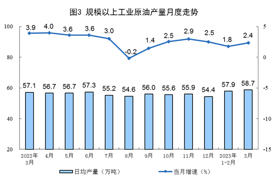 原油生產(chǎn)略有加快,進(jìn)口由降轉(zhuǎn)增。3月份,生產(chǎn)原油1818萬噸,同比增長2.4%,增速比1—2月份加快0.6個百分點,日均產(chǎn)量58.7萬噸。進(jìn)口原油5231萬噸,同比增長22.5%,1—2月份為下降1.3%。