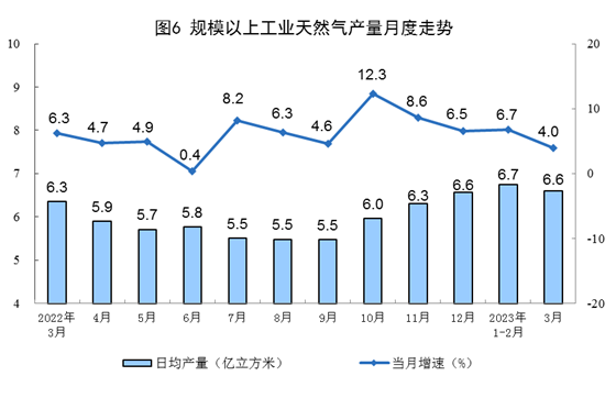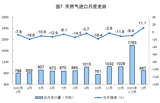 天然氣生產(chǎn)有所放緩,進(jìn)口由降轉(zhuǎn)增。3月份,生產(chǎn)天然氣205億立方米,同比增長4.0%,增速比1—2月份放緩2.7個百分點,日均產(chǎn)量6.6億立方米。進(jìn)口天然氣887萬噸,同比增長11.1%,1—2月份為下降9.4%。