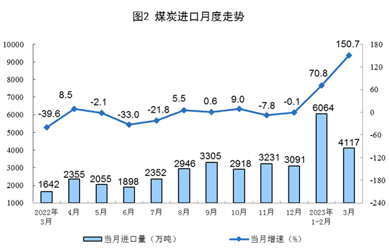 原煤生產(chǎn)穩(wěn)定增長,進(jìn)口大幅增加。3月份,生產(chǎn)原煤4.2億噸,同比增長4.3%,增速比1—2月份放緩1.5個百分點,日均產(chǎn)量1346萬噸。進(jìn)口煤炭4117萬噸,同比增長150.7%,增速比1—2月份加快79.9個百分點。