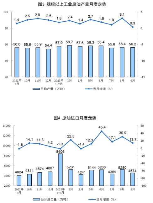 原油生產(chǎn)平穩(wěn)增長(zhǎng),進(jìn)口較快增長(zhǎng)。9月份,生產(chǎn)原油1687萬(wàn)噸,同比增長(zhǎng)0.3%,增速比8月份放緩2.8個(gè)百分點(diǎn),日均產(chǎn)量56.2萬(wàn)噸。進(jìn)口原油4574萬(wàn)噸,同比增長(zhǎng)13.7%,增速比8月份回落17.2個(gè)百分點(diǎn)。