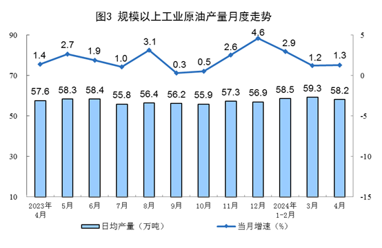 原油生產平穩(wěn)增長,進口由降轉增。4月份,規(guī)上工業(yè)原油產量1747萬噸,同比增長1.3%,增速比3月份加快0.1個百分點;日均產量58.2萬噸。進口原油4472萬噸,同比增長5.9%。