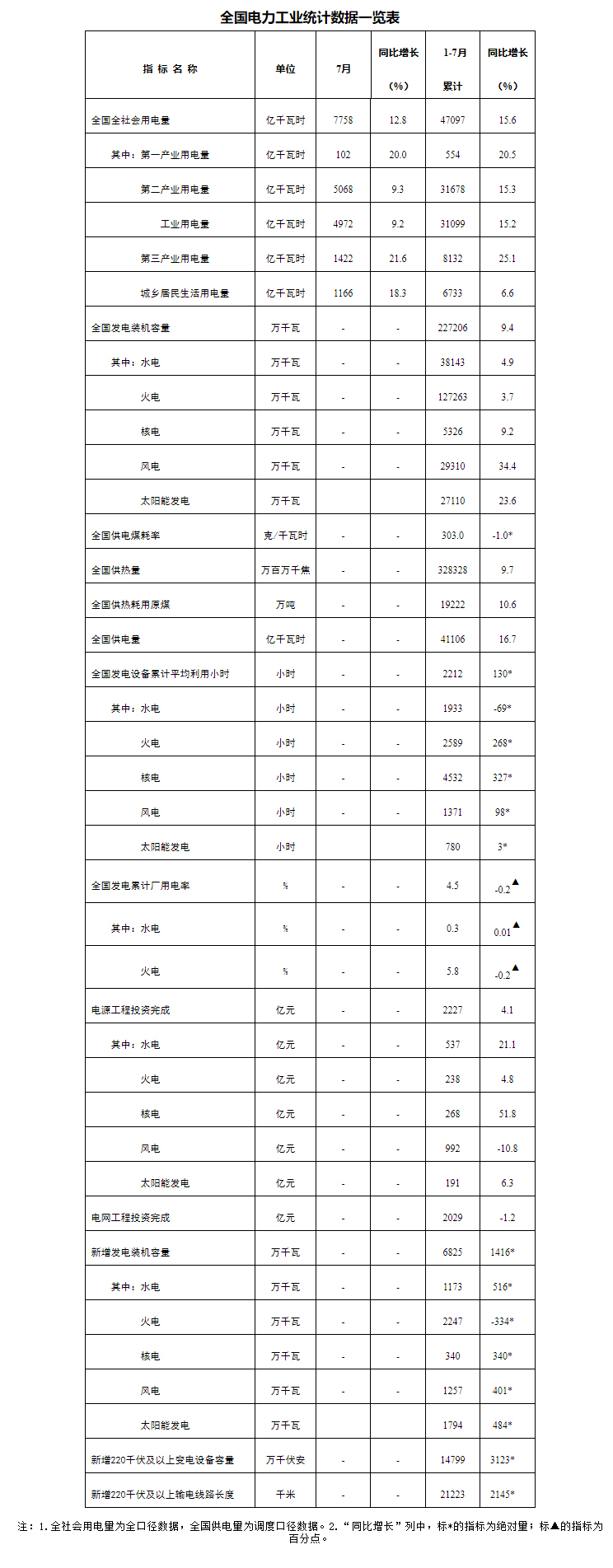 2021年1-7月份全國(guó)電力工業(yè)統(tǒng)計(jì)數(shù)據(jù)