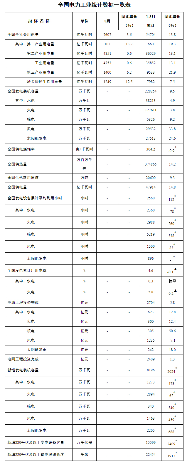 注:1.全社會(huì)用電量為全口徑數(shù)據(jù),全國(guó)供電量為調(diào)度口徑數(shù)據(jù)。2.“同比增長(zhǎng)”列中,標(biāo)*的指標(biāo)為絕對(duì)量;標(biāo)▲的指標(biāo)為百分點(diǎn)。