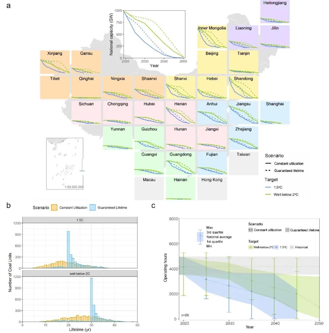 為實現(xiàn)《巴黎協(xié)定》氣候目標,未來30年中國需要在燃煤發(fā)電行業(yè)實現(xiàn)深度減排,并達到凈零排放。近期發(fā)表于《自然-通訊》上的研究對中國實現(xiàn)氣候目標和減排途徑的可行性展開了分析,研究者們首先依據(jù)技術(shù)屬性、盈利能力、環(huán)境影響對中國1037個現(xiàn)役燃煤電廠的退役優(yōu)先級進行逐一評估,并結(jié)合全球升溫1.5°C和2°C目標情景,提出了可持續(xù)的中國燃煤電廠退出路徑選擇。研究發(fā)現(xiàn),為實現(xiàn)氣候目標,中國需要在短期內(nèi)停止新建燃煤電廠,優(yōu)先退役落后產(chǎn)能,可以通過降低利用小時,保障大部分機組20年(1.5°C目標)或30年(2°C目標)的運行年限,并在2045年(1.5°C目標)或2055年(2°C目標)前實現(xiàn)全面的煤電退出。
