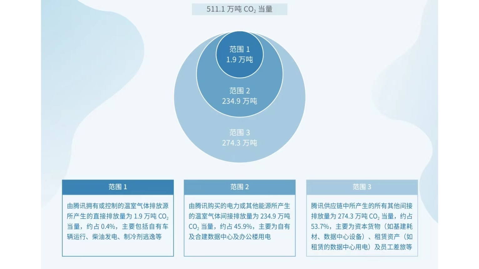 2021年,騰訊溫室氣體排放量總計(jì)511.1萬(wàn)噸。其中,公司擁有或控制的溫室氣體排放源所產(chǎn)生的直接排放量(即“范圍1”)、購(gòu)買(mǎi)的電力或其他能源所產(chǎn)生的間接排放量(即“范圍2”)分別為1.9萬(wàn)噸和234.9萬(wàn)噸;供應(yīng)鏈上下游產(chǎn)生的其他間接排放量(即“范圍3”)為274.3萬(wàn)噸。該結(jié)果是騰訊基于國(guó)際通行的碳減排范圍標(biāo)準(zhǔn)進(jìn)行的系統(tǒng)全面的碳盤(pán)查。