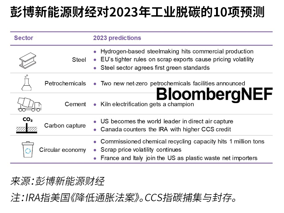 長(zhǎng)期以來(lái)被認(rèn)為難以減排的工業(yè)部門(mén)正在以比預(yù)期更快的速度脫碳。歐洲已經(jīng)開(kāi)始綠鋼試點(diǎn)生產(chǎn),水泥廠(chǎng)正在宣布全面的碳捕集裝置,加拿大和法國(guó)正在建造凈零石化綜合設(shè)施。2023年還會(huì)有更多此類(lèi)行動(dòng)。