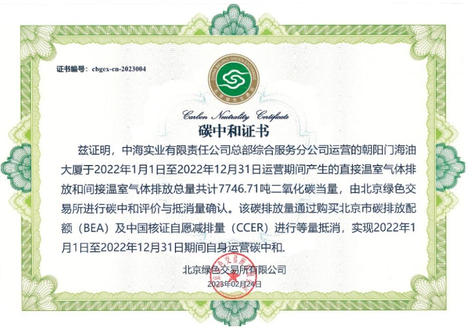 北京綠色交易所按照制定碳中和計劃、實施減排行動、碳排放核算、北京碳配額及CCER等量抵消,“碳中和”評價和聲明等全流程要求,支持中國海油總部大樓實現(xiàn)年度自身運營“碳中和”目標,并頒發(fā)“碳中和”證書。