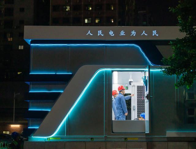 華燈初上,夜色闌珊,位于寶安區(qū)新橋街道的萬豐村,一座外形酷似魔方的建筑格外引人注目。只見一個巨大的南方電網(wǎng)logo映入眼簾,散發(fā)著柔和幽靜的藍色微光。“涓涓流淌”的飄帶與logo時而匯聚、時而分散,與背后高速穿梭的地鐵11號線交相輝映。這是南方電網(wǎng)深圳供電局研發(fā)的新型全預裝近零碳景觀配電站,被稱為“電力魔方”。