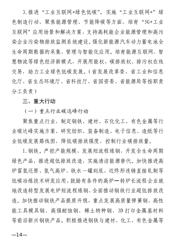10月10日,江西省工業(yè)和信息化廳、江西省發(fā)展和改革委員會和江西省生態(tài)環(huán)境廳發(fā)布《關(guān)于印發(fā)江西省工業(yè)領(lǐng)域碳達(dá)峰實施方案的通知》,《江西省工業(yè)領(lǐng)域碳達(dá)峰實施方案》提出,“十四五”期間,江西力爭產(chǎn)業(yè)結(jié)構(gòu)與用能結(jié)構(gòu)優(yōu)化取得積極進(jìn)展,能源資源利用效率明顯提升,綠色工廠和綠色園區(qū)分別達(dá)到200家和50家;到2025年,全省規(guī)模以上工業(yè)單位增加值能耗較2020年下降12%以上。“十五五”期間,力爭一批重點(diǎn)產(chǎn)品工藝能效達(dá)到國內(nèi)領(lǐng)先水平,基本建立以高效、綠色、循環(huán)、低碳為特征的現(xiàn)代工業(yè)體系;確保工業(yè)領(lǐng)域二氧化碳排放在2030年前達(dá)峰。