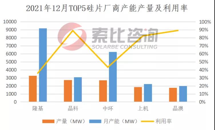 根據(jù)索比咨詢統(tǒng)計(jì),2021年12月,前五大硅料企業(yè)總產(chǎn)量4.14萬(wàn)噸,綜合產(chǎn)能利用率112.6%。硅片方面,兩家頭部企業(yè)開工率回至50%以上,一體化企業(yè)開工率相對(duì)較高。去年12月,國(guó)內(nèi)硅片產(chǎn)量17.85GW,環(huán)比下降8.6%。按照產(chǎn)量排名,隆基、晶科、中環(huán)、上機(jī)、晶澳位列前五,總產(chǎn)量12.35GW,占比69.19%,綜合利用率67.81%。雖然有觀點(diǎn)認(rèn)為,中環(huán)的實(shí)際產(chǎn)能利用率要高于上述數(shù)據(jù),但總體看,產(chǎn)業(yè)鏈上游價(jià)格居高不下,已經(jīng)影響到終端需求,并反作用于上游。