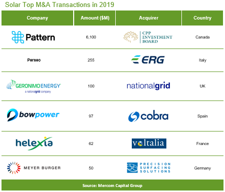 2019年,太陽(yáng)能領(lǐng)域有65項(xiàng)并購(gòu)交易,而2018年為82宗。大多數(shù)交易涉及太陽(yáng)能下游企業(yè)。2019年,BayWa,EDF可再生能源和Engie均收購(gòu)了兩家公司。 2019年最大的一筆交易是加拿大退休金計(jì)劃投資委員會(huì)(CPPIB)以61億美元收購(gòu)Pattern Energy的交易。