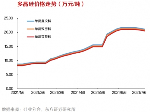 或許是在大擴(kuò)產(chǎn)的預(yù)期下,近期硅料普遍價格由大漲轉(zhuǎn)向松動。根據(jù)硅業(yè)分會數(shù)據(jù),上周國內(nèi)單晶復(fù)投料成交均價下滑至 20.81 萬元/噸,周環(huán)比降幅為 1.61%;單晶致密料成交均價下滑至 20.6 萬元/噸,周環(huán)比降幅為 1.06%;單晶菜花料成交均價下滑至 20.35 萬元/噸,周環(huán)比降幅 0.73%。