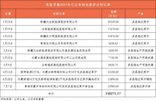 與此同時,國內(nèi)多晶硅還原爐市占率第一、該細(xì)分領(lǐng)域絕對龍頭的雙良節(jié)能也受益頗豐(還原爐是生產(chǎn)多晶硅的重要設(shè)備),近三年來累計(jì)為行業(yè)各家硅料企業(yè)提供三百多臺大型高效還原爐。據(jù)公告統(tǒng)計(jì),2021年以來公司已簽訂的多晶硅還原爐項(xiàng)目已高達(dá)15.02億元,相比2020全年多晶硅還原爐系統(tǒng)實(shí)現(xiàn)的1.77億元收入,大幅增長748.59%。