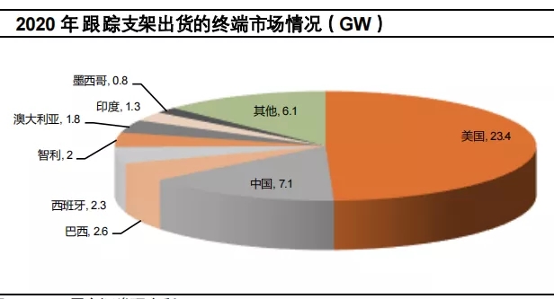 近年,隨著光伏需求的增長以及跟蹤支架性價比的提升,全球跟蹤支架出貨量呈現快速增長。據彭博新能源統(tǒng)計,2020年度全球跟蹤支架出貨 47.5GW,其中美國市場需求23.4GW,占比約50%。此外,拉丁美洲、西班牙、澳大利亞、印度、中東等光照條件比較好的地區(qū)的跟蹤支架需求也很可觀。