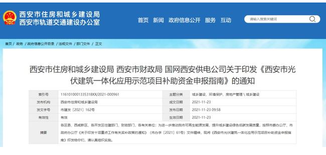 11月23日,西安市住房和城鄉(xiāng)建設(shè)局,西安市財(cái)政局,國(guó)網(wǎng)西安供電公司印發(fā)了《西安市光伏建筑一體化應(yīng)用示范項(xiàng)目補(bǔ)助資金申報(bào)指南》的通知。實(shí)施年限為2021~2023年。