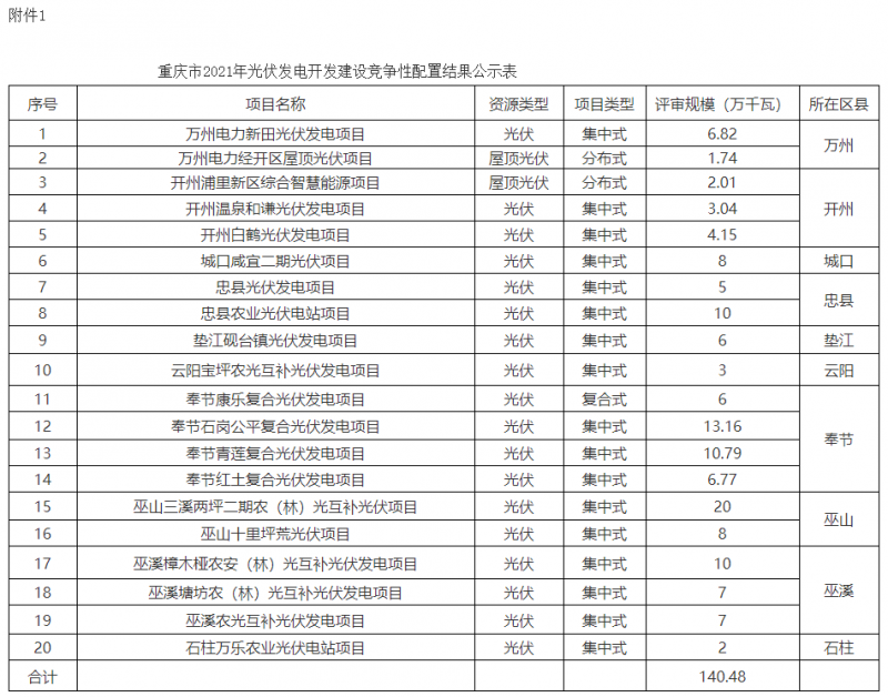 附件:1.重慶市2021年光伏發(fā)電開發(fā)建設競爭性配置結果公示表