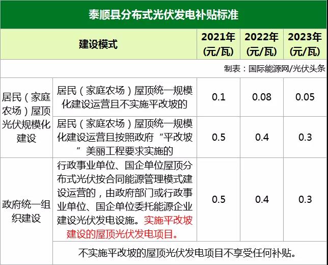 居民(家庭農(nóng)場)屋頂光伏規(guī)?;ㄔO(shè)。居民(家庭農(nóng)場)屋頂統(tǒng)一規(guī)模化建設(shè)運營且不實施平改坡的,在光伏發(fā)電項目建成、并網(wǎng)和驗收后給予居民發(fā)放一次性建設(shè)補貼。2021年、2022年、2023年建成、并網(wǎng)和驗收的實行差異化補貼,補貼標準分別為0.1元/瓦、0.08元/瓦、0.05元/瓦;