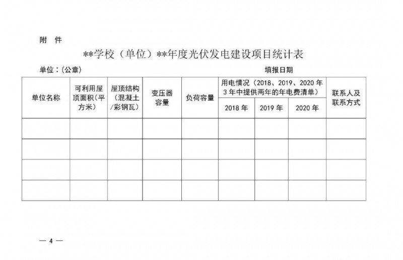 在“陽光校園”工程實(shí)施期間,各高等學(xué)校、省屬中等職業(yè)學(xué)校、廳直屬單位(學(xué)校)擬開展光伏發(fā)電項(xiàng)目建設(shè)的,請(qǐng)?zhí)顖?bào)《**學(xué)校(單位)**年度光伏發(fā)電建設(shè)項(xiàng)目統(tǒng)計(jì)表》,加蓋單位公章,于每年12月底前將下一年度實(shí)施計(jì)劃報(bào)送省教育廳發(fā)展規(guī)劃處,省教育廳將根據(jù)有關(guān)安排積極推進(jìn)“陽光校園”工程。